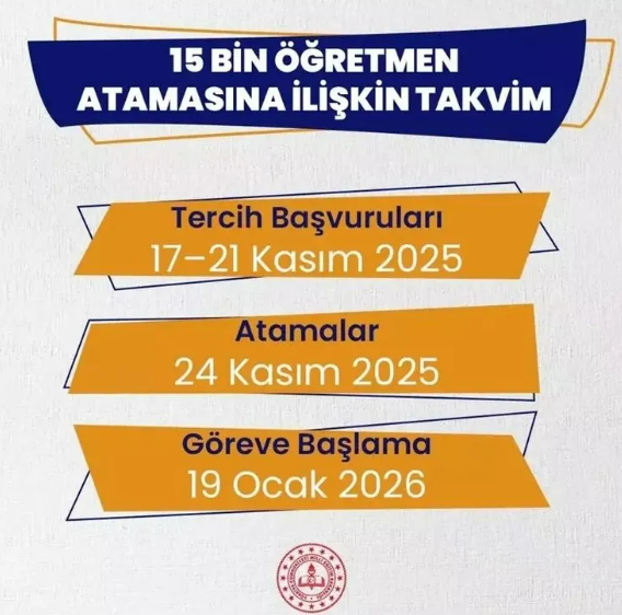 Buna göre öğretmen adayları, eğitim kurumu tercih başvurularını 17 – 21 Kasım 2025 tarihleri arasında elektronik ortamda yapacak olup atamalar, 24 Kasım 2025 tarihinde gerçekleştirilecek.